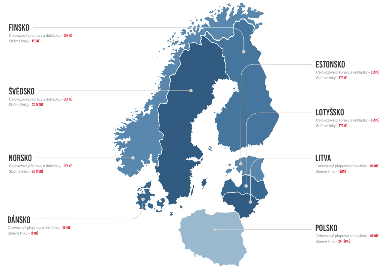 Specializujeme se na přepravu zásilek do států severní Evropy. Hlavními destinacemi jsou Švédsko, Norsko, Finsko a Dánsko.